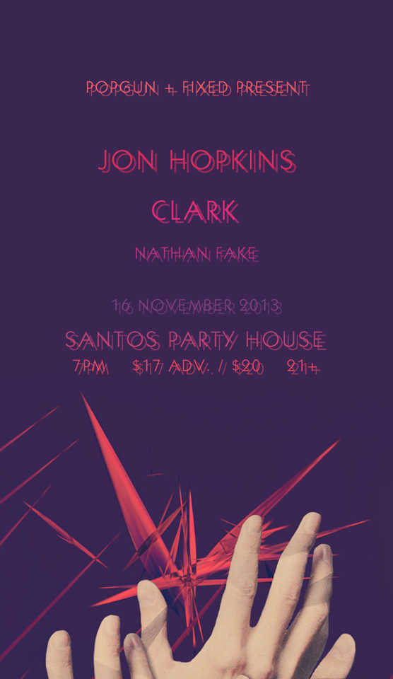 Jon Hopkins, Clark, Nathan Fake @ Santos Party House 7pm ($10) Jon Hopkins has lost the much revered Mercury Prize twice. That’s two times more