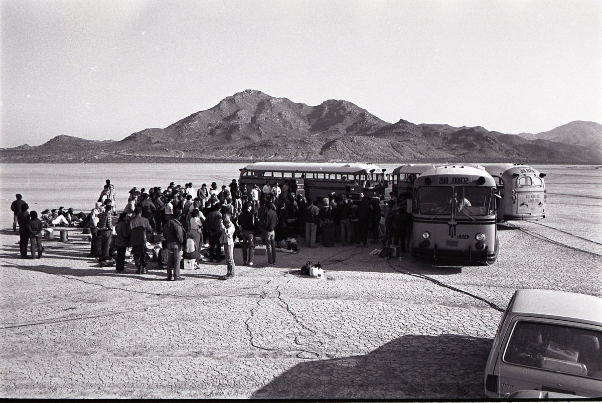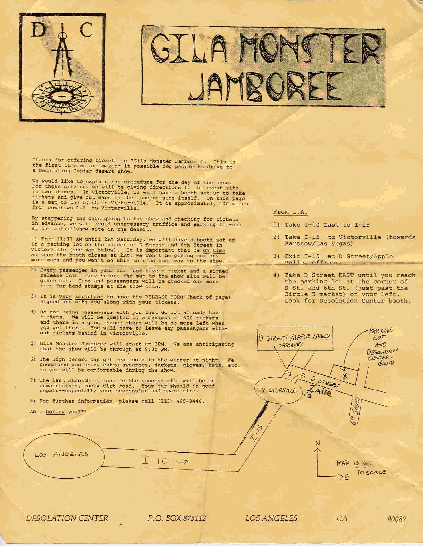 A handful of these shows took place in the Mojave Desert. For the first, attendees were instructed to get on school buses, unaware of where they would be taken or how to prepare for the harsh desert conditions. Crowdsourced photos and audio recordings show this occurring in the middle of nowhere with the school buses parked in such a way so as to protect the audience and bands from heavy desert winds. The following Desolation Center event saw the Minutemen play on a boat to their hometown audience in San Pedro, followed by the psychedelic music of the Meat Puppets. The “Gila Monster Jamboree” had attendees participate in a crosstown scavenger hunt to find the show. Once they reached the final location, again in the Mojave, they partook in free LSD and a lineup that included Sonic Youth, the Meat Puppets, and Psi/ Com, Perry Farrell’s band before forming Jane’s Addiction.