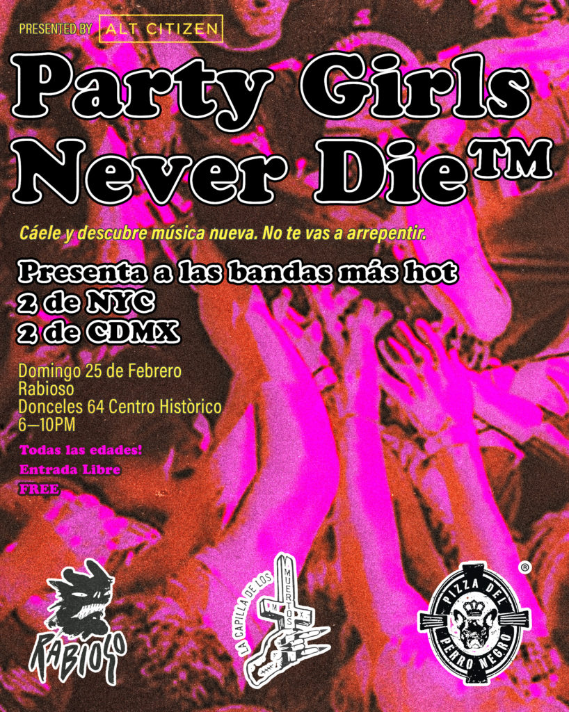 We’re hosting Party Girls Never Die, a Punk Show. Party Girls Never Die is a touring party series which specializes in satellite events. They will be in Mexico City alongside Treasure Club International for their 2 Day Music Festival. They are throwing a punk show featuring unannounced bands, 2 from NYC and 2 from Mexico City. We curated all the live acts. This show will be held at the legendary Rabioso located at Donceles 64, Centro Histórico de la Cdad. de México, Centro, Cuauhtémoc, 06010 Ciudad de México, CDMX, Mexico.