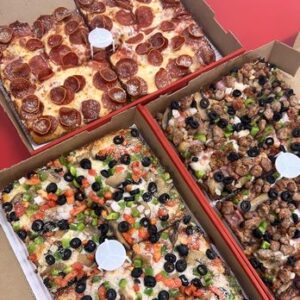 We asked Noah to join the band at a meeting over this Detroit-style fast food pizzeria on Flatbush Avenue. We got pepperoni with the flavor-blasted crust with parmesan cheese, garlic, and whatever else was on there.