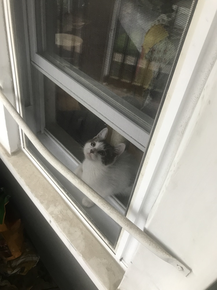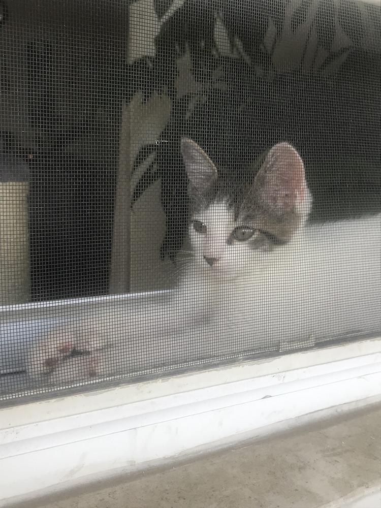 2. Playing with the cat who lives downstairs through the screen on my porch