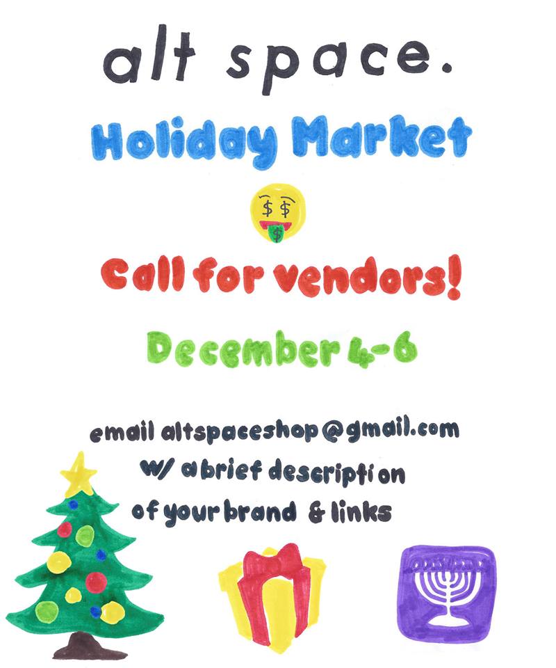 Calling all NYC-based creatives! Come be a part of our holiday market, email altspaceshop@gmail.com by 11/22 to apply for a table during our upcoming holiday pop-up market.