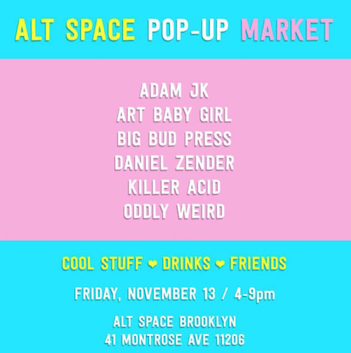 Join us at Alt Space for a Pop-Up Market featuring cool items by artists like Adam Jk, Art Baby Girl, Big Bud Press, Daniel Zender,