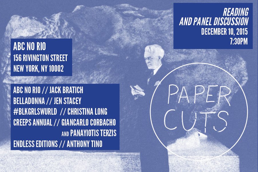 Come to Paper Cuts Bookstore Tour Edition 3! A Zine Reading and Panel Discussion featuring: Jack Bratich from the ABC No Rio Zine Library, Jen Stacey from Belladonna, Christina