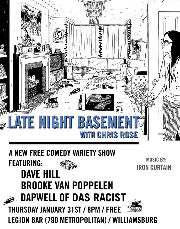Late Night Basement @ Legion (Williamsburg), 8pm, FREE! This is the first night a new comedy show hosted by Chris Rose (MTV, The Onion, The