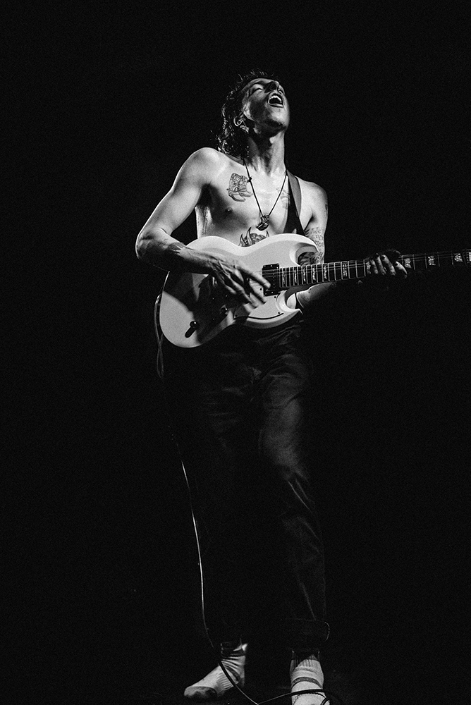 The members of Shybaby stood out in their own way, though. Grace and Tess Mooreland, who share guitar and vocal duties, and bassist Ben Hansen have taken to bedazzling their faces with deep reds, crystal blues, and shimmery silver jewels that reflect off of them from the stage. Drummer Charlie McGrath draws a line in the sand when it comes to joining in on these delightful sparkles. That said, the giant devil woman tattooed on his torso who makes an appearance at every show still leaves her own impression on the audiences’ memory.