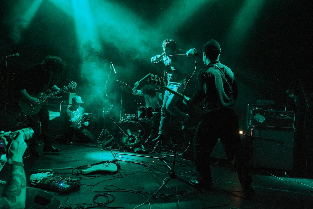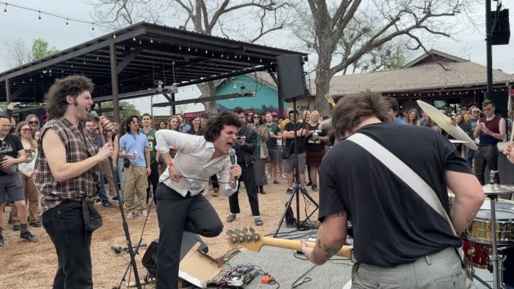 Something about their sound just stopped me cold. Their stage was a DIY carpet, a few amps, and a spray-painted backdrop. The crowd was already locked in, smiles on their faces, as lead singer Danny Gomez was on the floor, screaming into a mic. Needless to say, I stayed. And as they wrapped up their set, I remember thinking — these guys fucking rock.