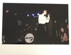 I insist that she continue whatever she’d been doing before we invaded the basement green (blue) room, and she nonchalantly tells us that she was taking a swig of tequila. A few moments later, her drummer appears with the same smoking bundle of sage, saying that he’d been scolded upstairs for setting something on fire in the venue, weirdly. Meg and her bandmates have a very mellow aura offstage in the middle of the afternoon, so I wasn’t sure what to expect from her show. We left her to finish her chicken and rice.