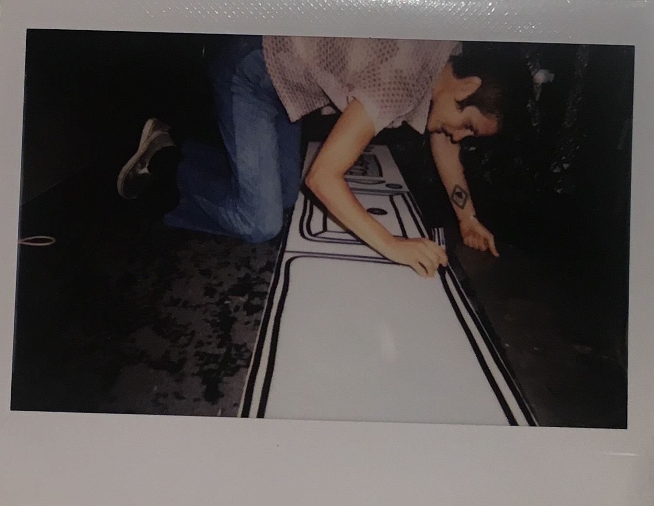 It’s called “KITSCHIN” which Montana Simone from Idio Gallery had made up, it was originally going to be there until the gallery was shut down. This all kind of started with my rug drawings that I do, then I made a tabletop drawing then I had a friend make silkscreen tablecloths—she sent them to me but they got lost in the mail so I never even fucking saw them which is such a bummer—but then I made placemats which going into your own production is awful. Then I had an idea to make an entire kitchen space based on those ideas and the line drawings.