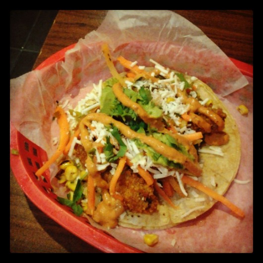 SXSW for me is as much about food as it is about bands, so during the day-to-evening party changeover, I headed up to the University of Texas Austin campus area to hit up one of my favorite local taco spots, Torchy’s Tacos. Every year, Torchy’s fried avocado taco is at the top of my Austin Food Checklist, but The Independent, the latest vegetarian addition to their taco menu, might knock the battered avocado delicacy off its #1 spot in my heart. This new taco has fried portobello mushroom strips with refried black beans, corn, avocado, carrots, queso fresco, and fresh cilantro with a drizzle ancho aioli. I was not prepared for the flavor explosion at the first bite. Attention all vegetarians! This is the best veggie taco ever. Nothing you will ever eat as a vegetarian will taste as good as this taco. Not exaggerating, bros.