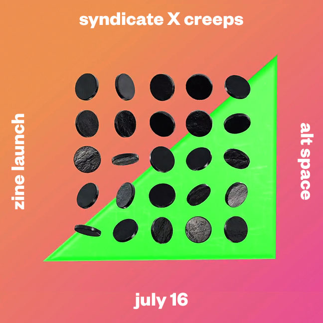 Alt Space Presents: Creeps Annual X Syndicate Zine Launch Party and Video Exhibition Video exhibition features videos by Sierra Siemer and Chris Bruffee Exhibition Dates: July