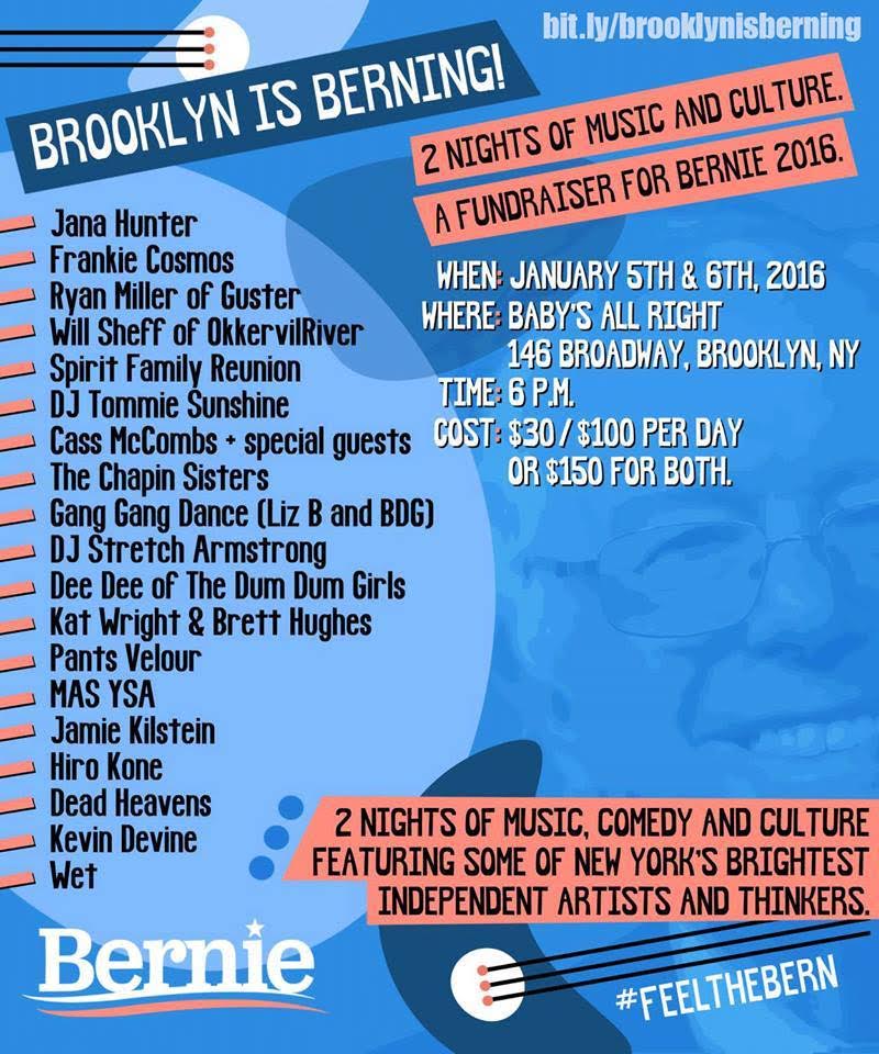 Brooklyn Is Berning! is a two night official fundraiser for Bernie Sander’s 2016 campaign with performances and appearances by: DJ Tommie Sunshine, Jana Hunter, Frankie