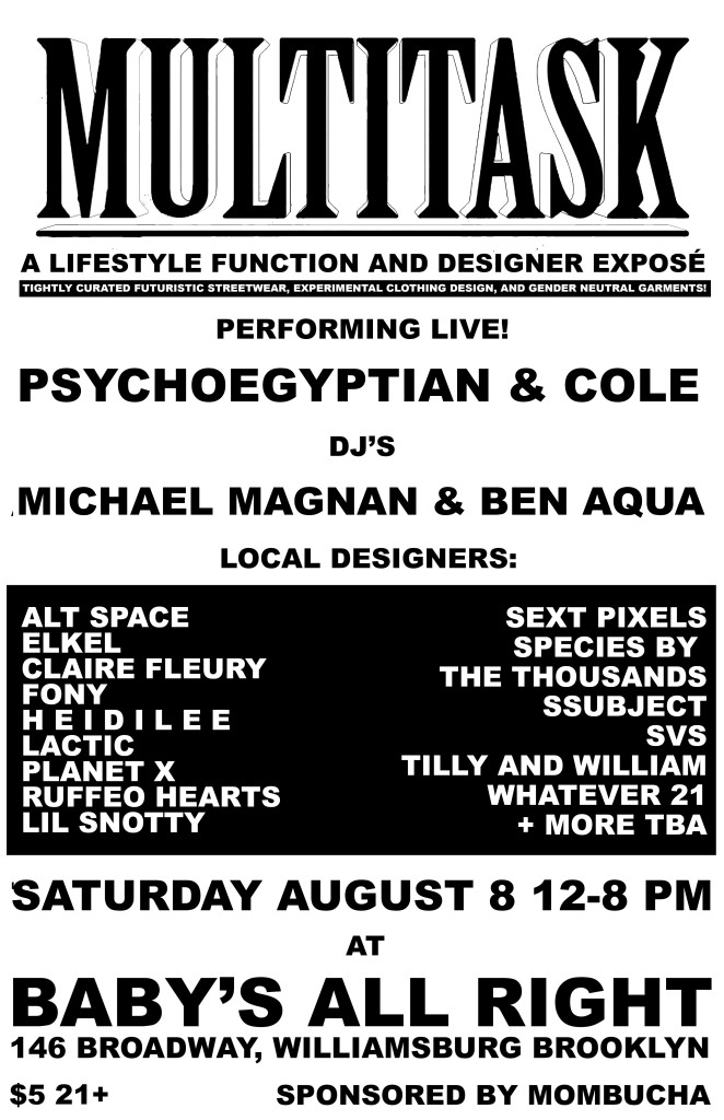 Multitask, a designer exposé that showcases tightly curated experimental clothing design and gender neutral garments is having a day rave at Baby’s All Right this