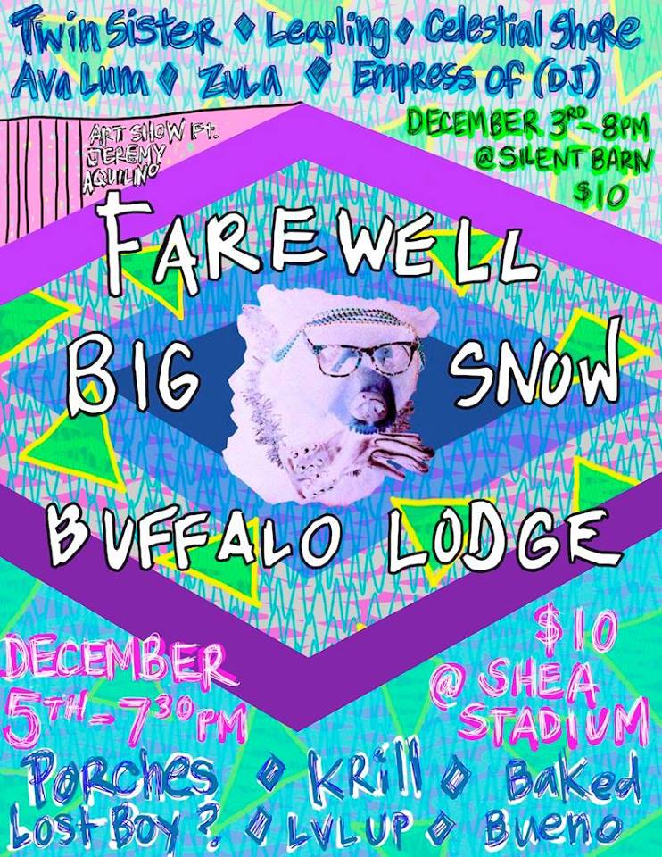 Big Snow Farewell Party with Twin Sister, Leapling, Ava Luna + More @ Silent Barn 8pm ($10) Bid so long, farewell, auf wiedersehen, goodbye to one