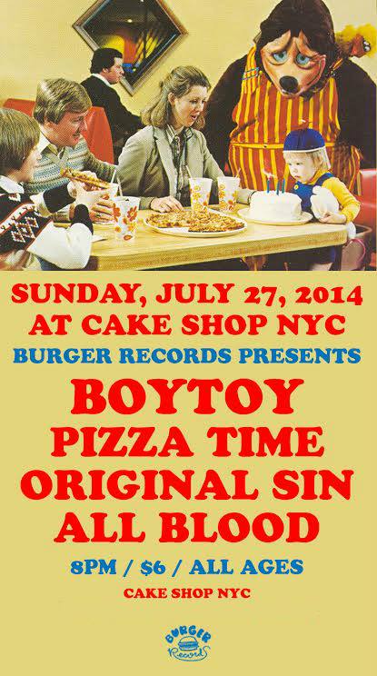 BOYTOY, Pizza Time, Original Sin, All Blood @ Cake Shop 8pm ($6) All of these band names are fucking amazing, therefore it’s totally worth it