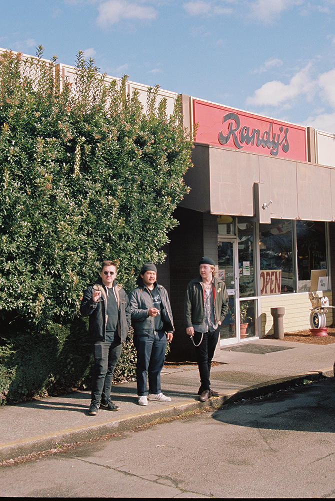Post-brekkie cig in Seattle — Eric, Tyger, and Tanner after fueling up on an off-day while simultaneously waiting on van repairs