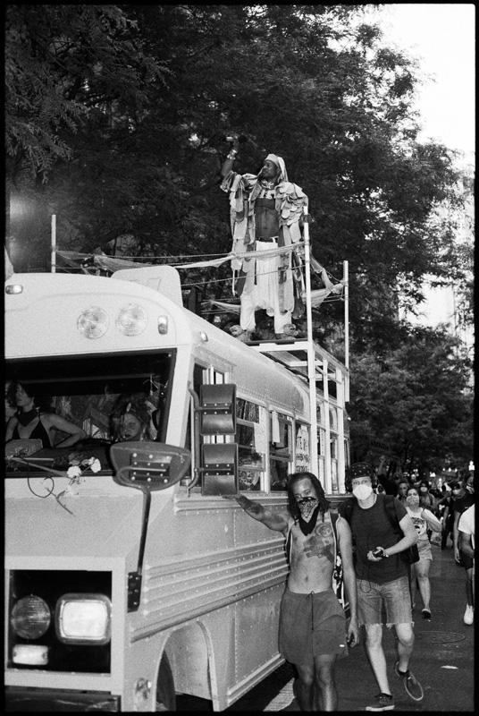 Paperboy’s Instagram is a hodgepodge of their iconic everyday outfits: wedding dresses on the basketball court, red capes, crowns on top of lime green wigs. They’re not shy about putting on a show to spread political awareness, or driving around Brooklyn in a decked-out renovated unicorn school bus with a makeshift stage on the roof, which they use as a podium for protests and rally speeches, from which they shout voting chants to rally support for their campaign.